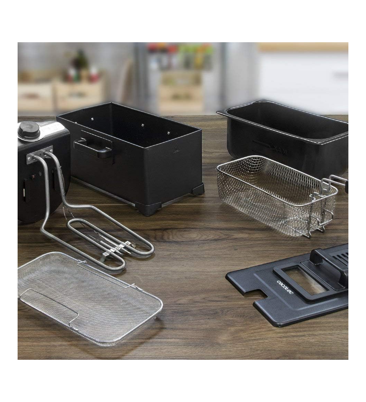 The Cecotec CleanFry is a powerful 3-litre electric deep fryer with 2000 W heating and adjustable temperature up to 190ºC. It features a dishwasher-safe enamel bowl, an OilCleaner filter to keep oil fresh, and a steel lid with an odor filter and viewing window. Designed for easy cleaning and safe use, it includes overheat protection and cable storage—all wrapped in a sleek black finish.