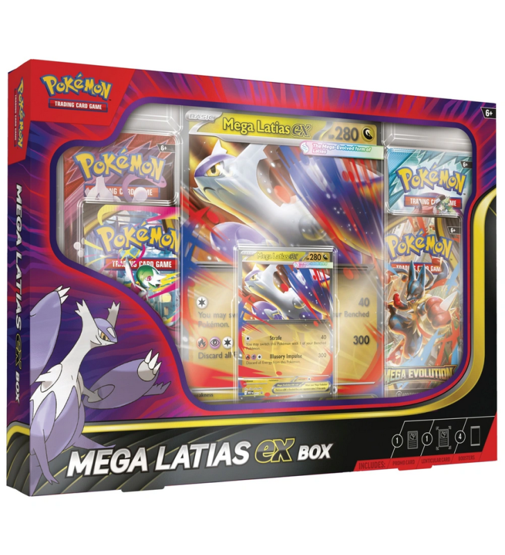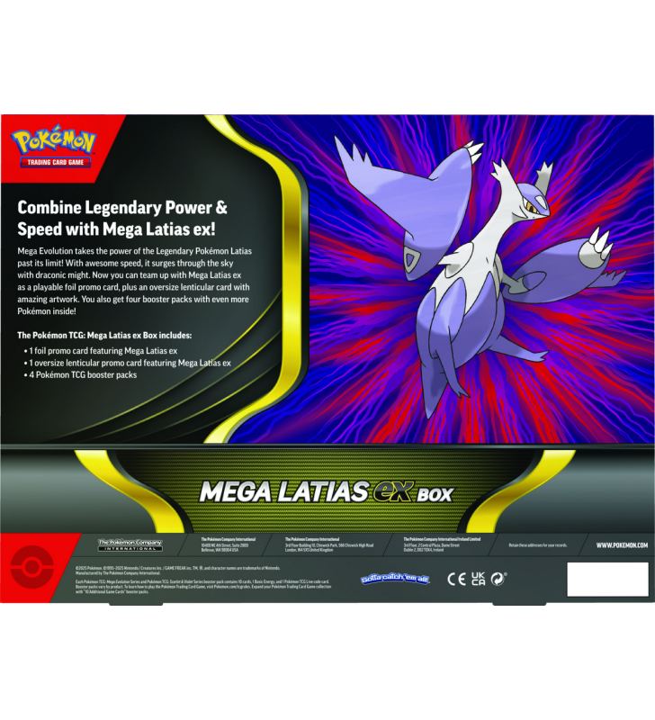 Mega Evolution takes the power of the Legendary Pokémon Latias past its limit! With awesome speed, it surges through the sky with draconic might. Now you can team up with Mega Latias ex as a playable foil promo card, plus an oversize lenticular card with amazing artwork. You also get four booster packs with even more Pokémon inside!