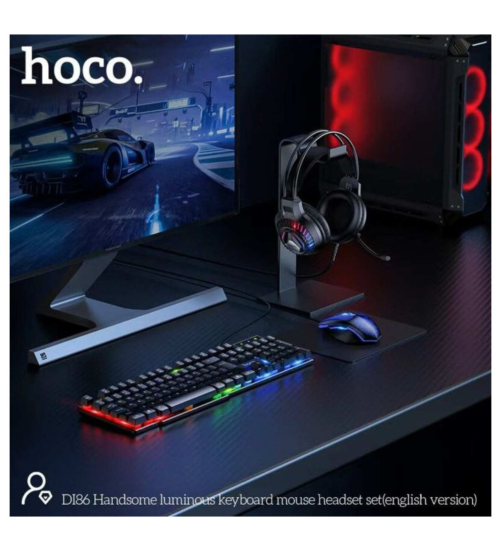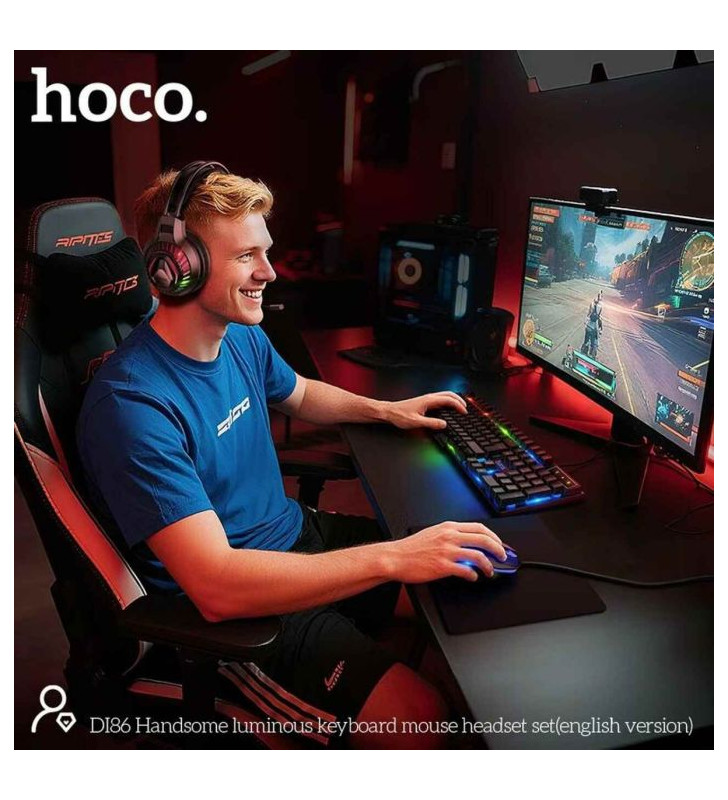 The Hoco DI86 4-in-1 RGB Gaming Set delivers the perfect blend of precision, comfort, and immersive style for gamers and professionals alike. Designed for long hours of gameplay or productive work, this bundle includes a luminous RGB keyboard, ergonomic mouse, vibrant headset, and durable mouse pad — everything you need to level up your setup.