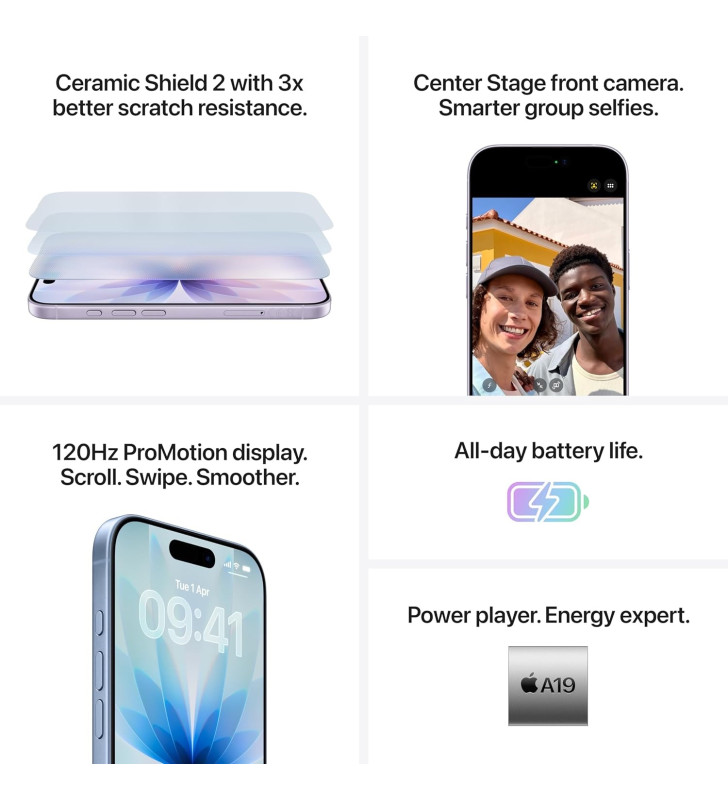 Powered by the A19 chip with Neural Accelerators and hardware-accelerated ray tracing, iPhone 17 delivers lightning-fast performance for gaming, creativity, and multitasking. With Apple Intelligence integrated across apps, you get smart assistance, communication, and creativity — all with industry-leading privacy.
