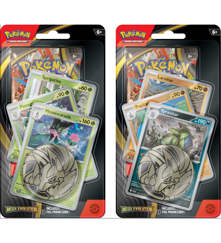 Choose your Pokémon partners and prepare for the biggest battles with the Pokémon Trading Card Game (TCG): Premium Mega Evolution Checklane range! Available in two versions (each sold separately), they come with an awesome booster pack, three promo cards featuring a full Evolution chain of either the Grass- and Dark-Type Meowscarada, or the Rock- and Dark-Type Tyranitar, as well as a cool Mega Lucario metallic coin and a code card for the Pokémon TCG Online!