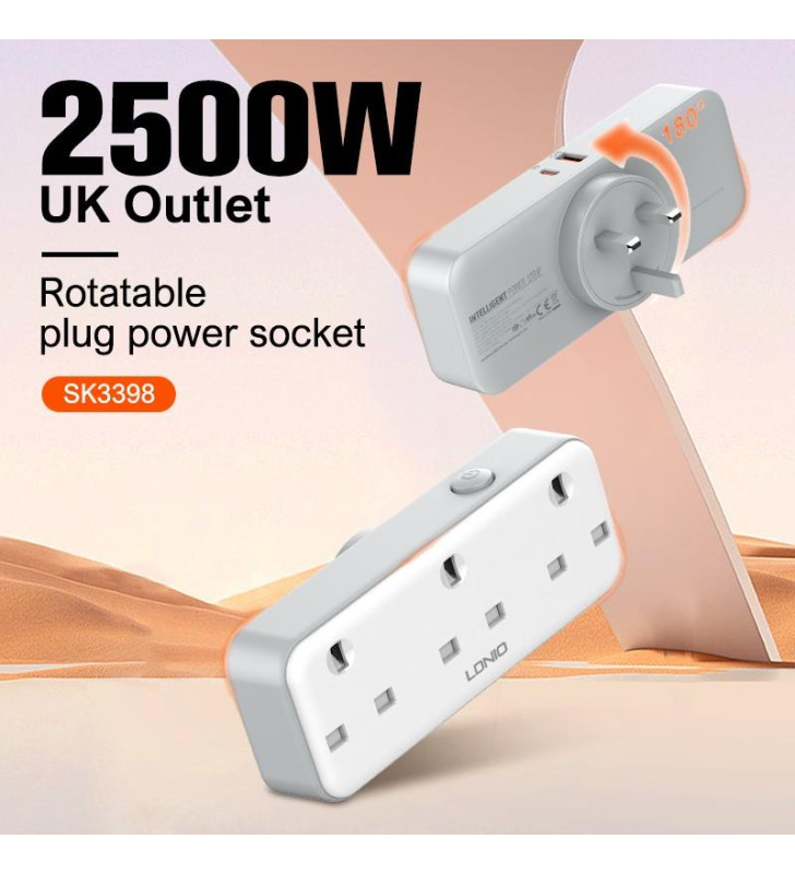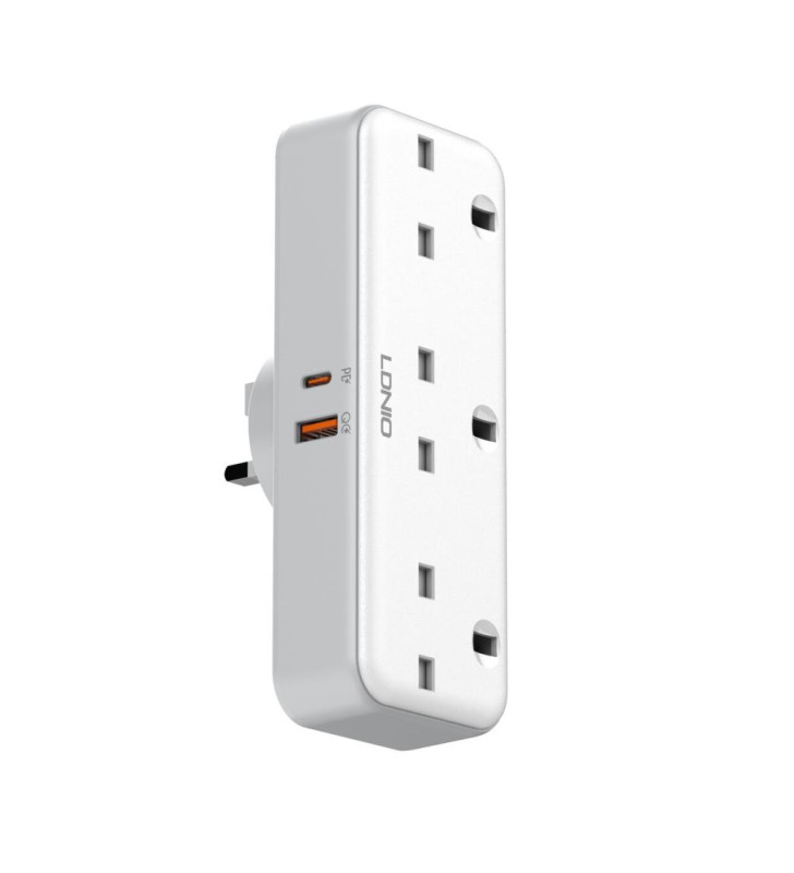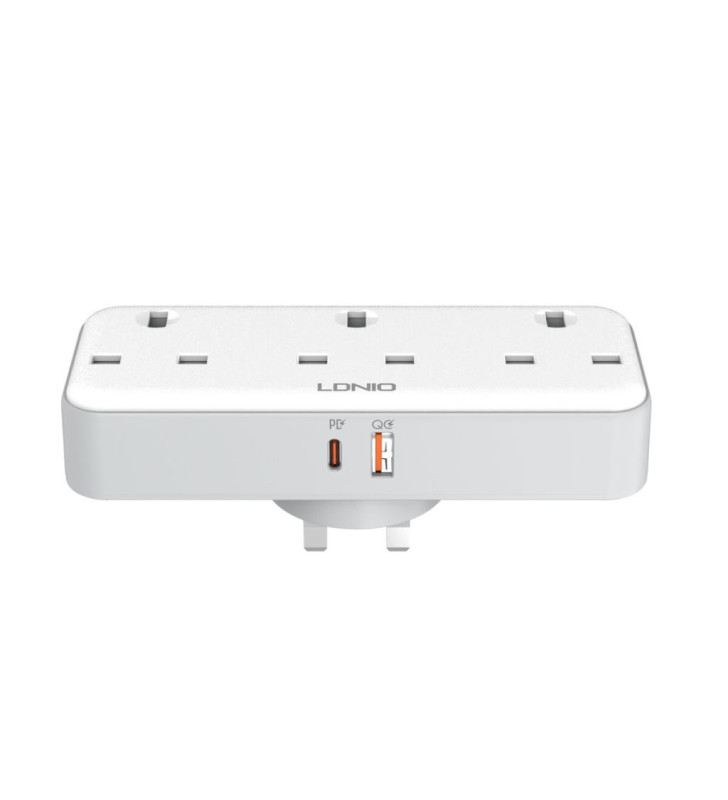 Expand your power options safely and efficiently with the LD 3-Way Rotatable Plug Expansion Adapter, featuring 3 UK sockets and dual USB ports (USB-C & USB-A) for charging and powering up to five devices simultaneously.