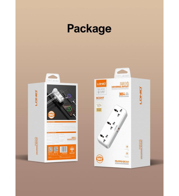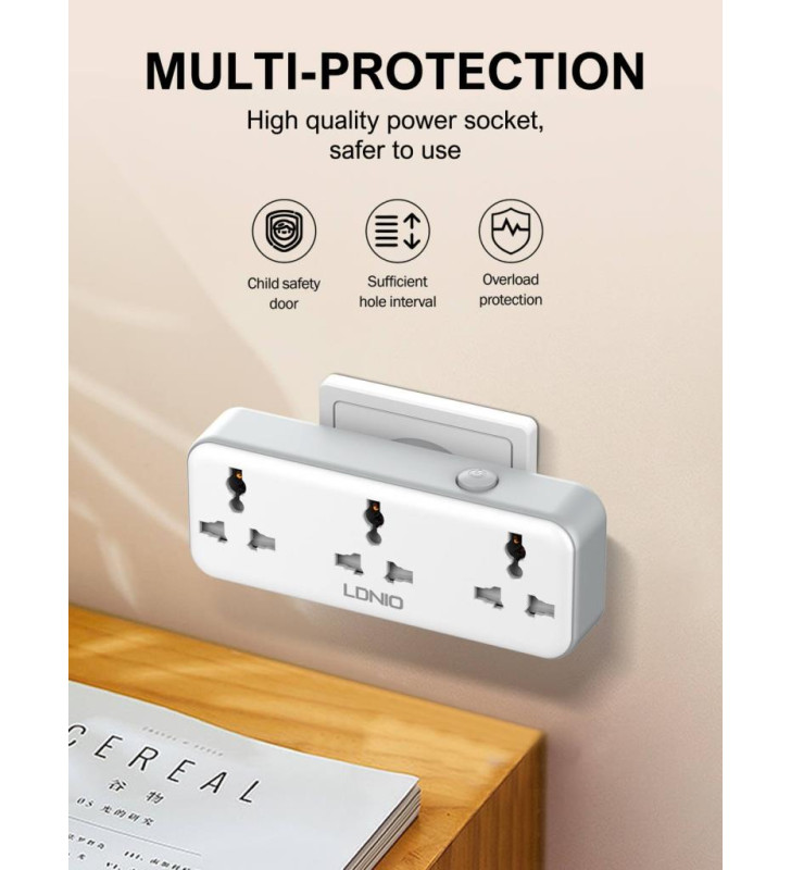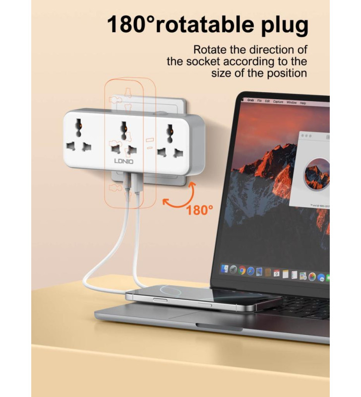 The rotatable 180° plug design ensures flexibility and easy access to wall sockets, even in tight spaces or behind furniture. Built with high-grade fireproof PC material, the LD 3-Way Plug offers reliable protection against spikes, surges, and electromagnetic interference, keeping your electronics safe from power fluctuations.