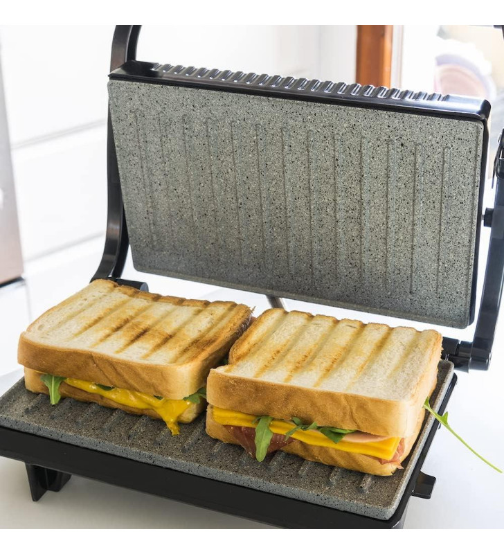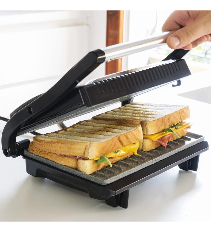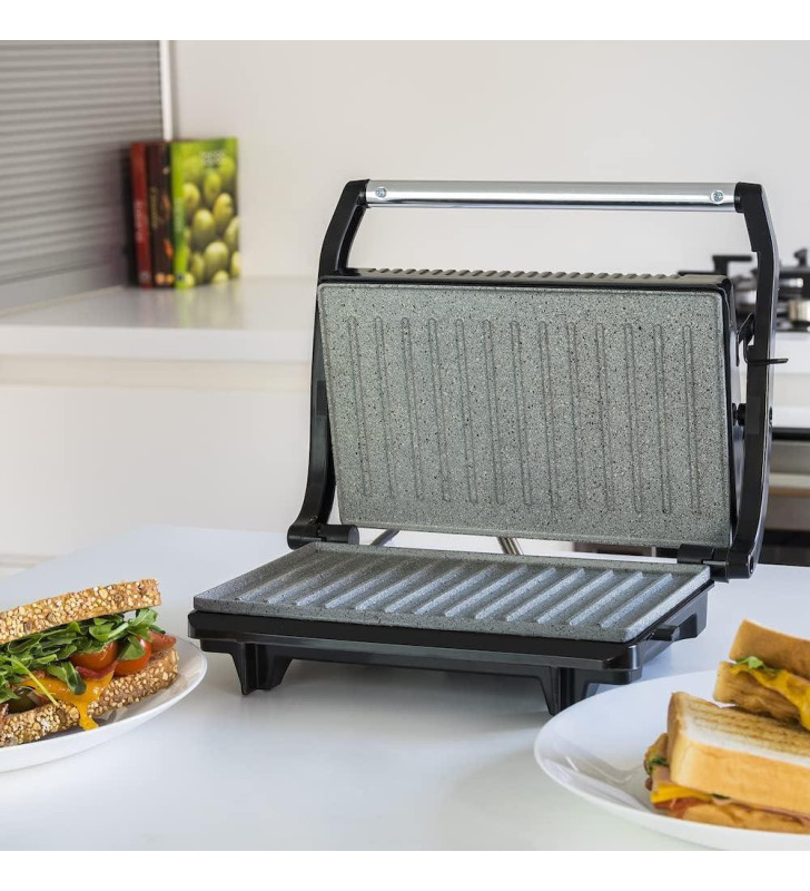 Compact 700W electric grill and sandwich maker with RockStone non-stick coating, adjustable floating top plate, and vertical storage design for easy, everyday use.