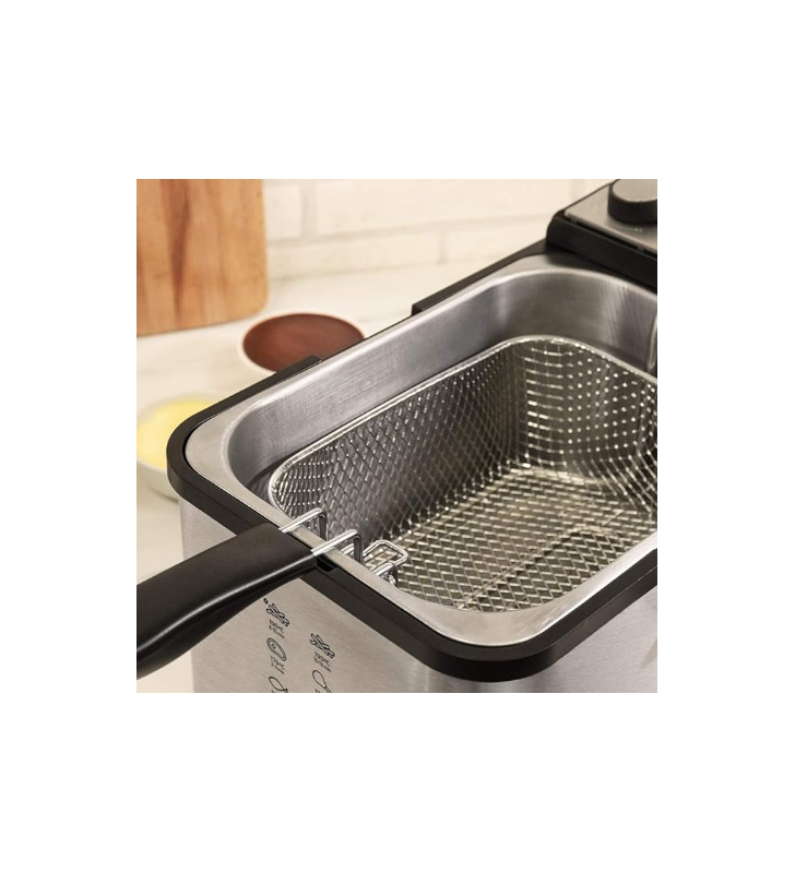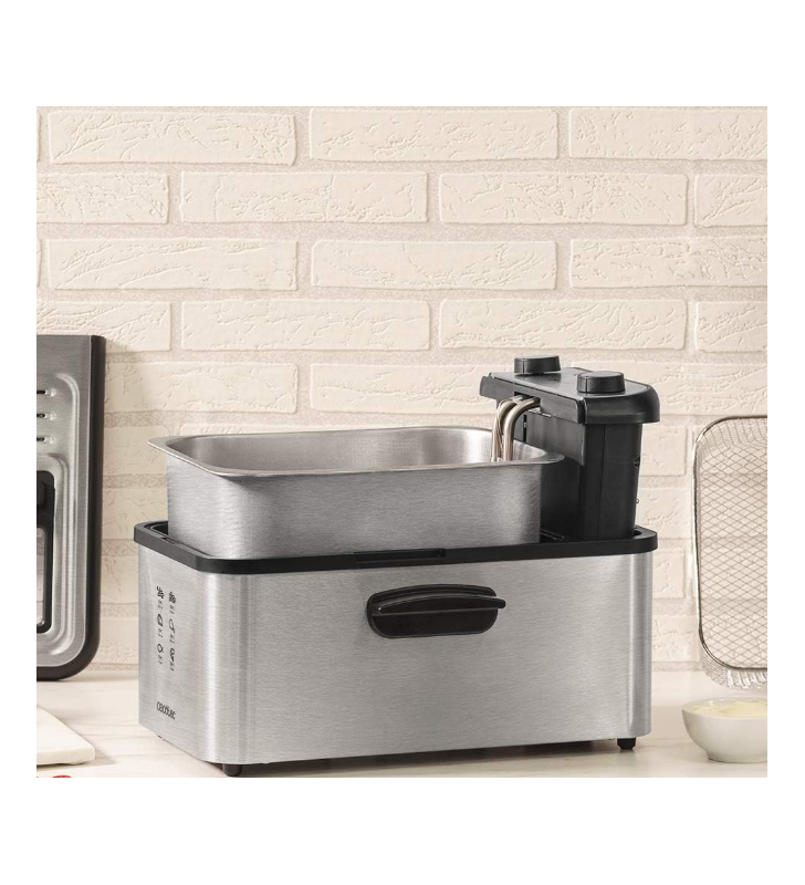 High-performance 3L stainless steel deep fryer with OilCleaner filter, 2400W power, adjustable temperature, timer, and dishwasher-safe parts for effortless cleaning.