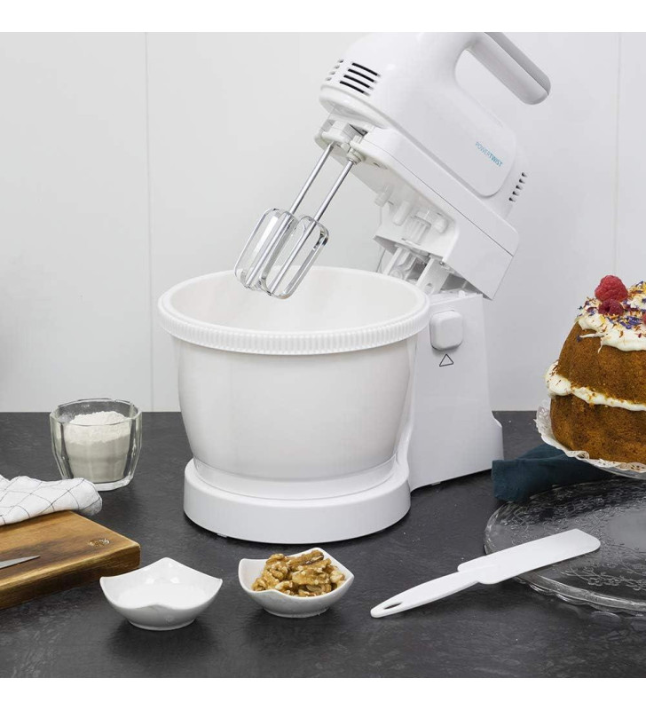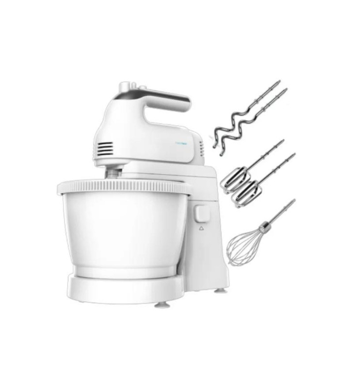 Powerful 500W hand mixer with a 3.5L self-rotating bowl, 5 speeds + turbo, and stainless-steel accessories for effortless mixing, beating, and kneading.