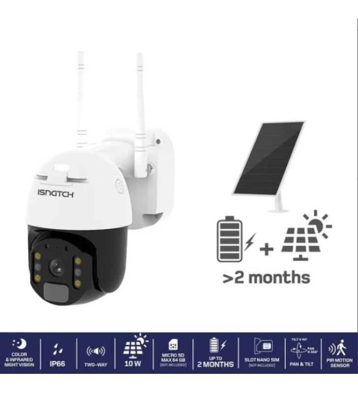 Motorized Camera Operating With 4g Sim, Equipped With Battery Pack And Solar Panel To Prolong Its Autonomy. The Video Resolution Is Full Hd 1080p, Talk & Listen Function Thanks To The Integrated Speaker And Microphone. Record Audio And Video On Micro Sd (Max. 64gb Not Included) And Sends Push Notifications In The Event Of A Motion Event Thanks To The Integrated Pir Sensor.The Solar Panel Connects To The Battery Pack With A 2.8m Cable Which Allows The Panel To Be Oriented Towards The Point With The Greatest Exposure To The Sun.