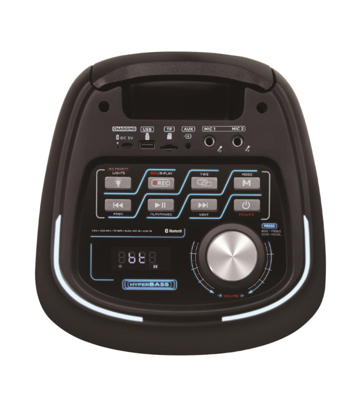 HYPERBASS Party Trolley Speaker with Double 6.5" RGBRing-Light Output Power: 40W RMS (at <10% THD)Speaker Drivers: 2x 6.5" Bass