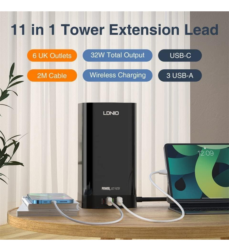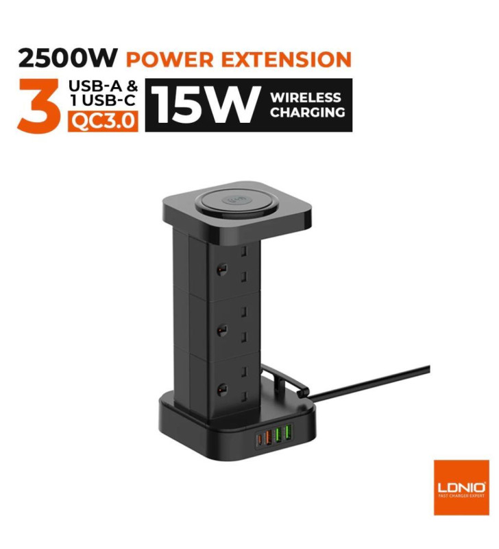 6 x Socket & 4 x USB Ports with Wireless Charging Pad2500W Tower Extension Power Socket & CableCable Management Keep your Desktop Tidy