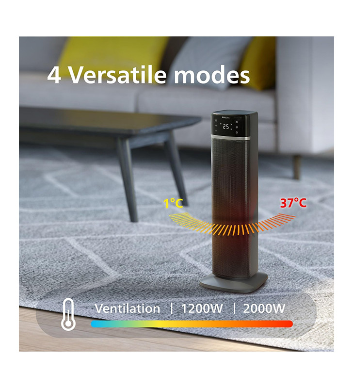 Choose from 4 heating modes and set your target temperature from 1–37°C. Select between 1200W or 2000W power for personalised comfort, or switch to fan mode for cool air during warmer months.