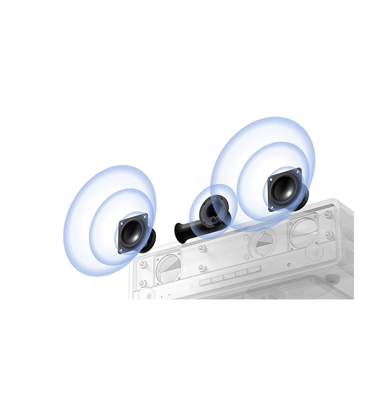 Built-in 2.5" stereo speakers and a bass-reflex port produce rich, full sound — perfect for bedrooms, offices, or smaller living spaces. You can also connect external speakers via RCA outputs, or plug in your headphones for private listening.