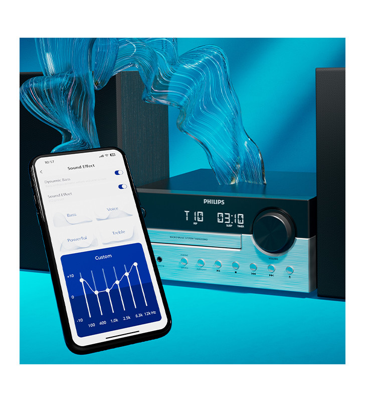 Enjoy your favourite tunes your way—whether from Bluetooth® 5.4, CDs, USB, or FM radio with 20 presets. With support for Auracast™, you can broadcast your music wirelessly to compatible speakers throughout your home. The Philips Entertainment app lets you control playback and choose from Digital Sound Control presets like Powerful, Clear, Bright, Warm, or Balanced—all from your smartphone.
