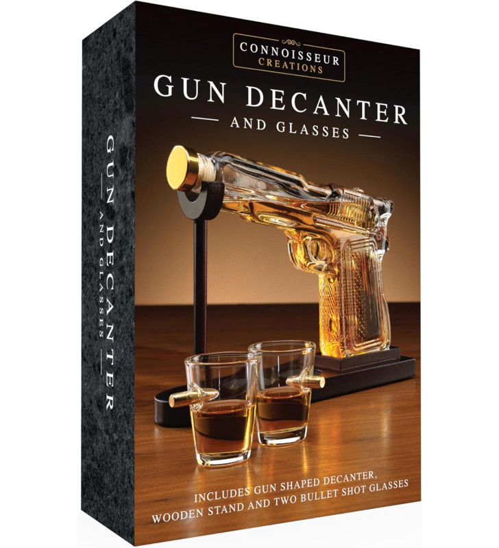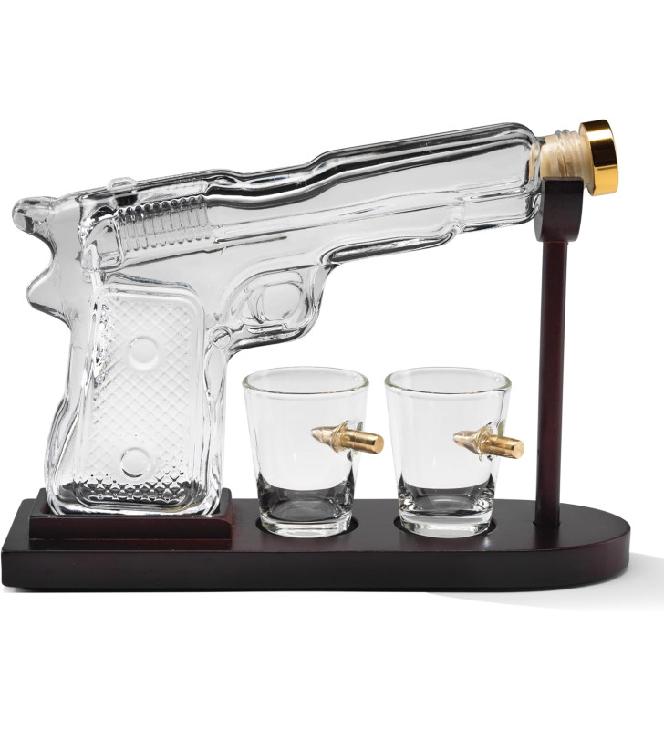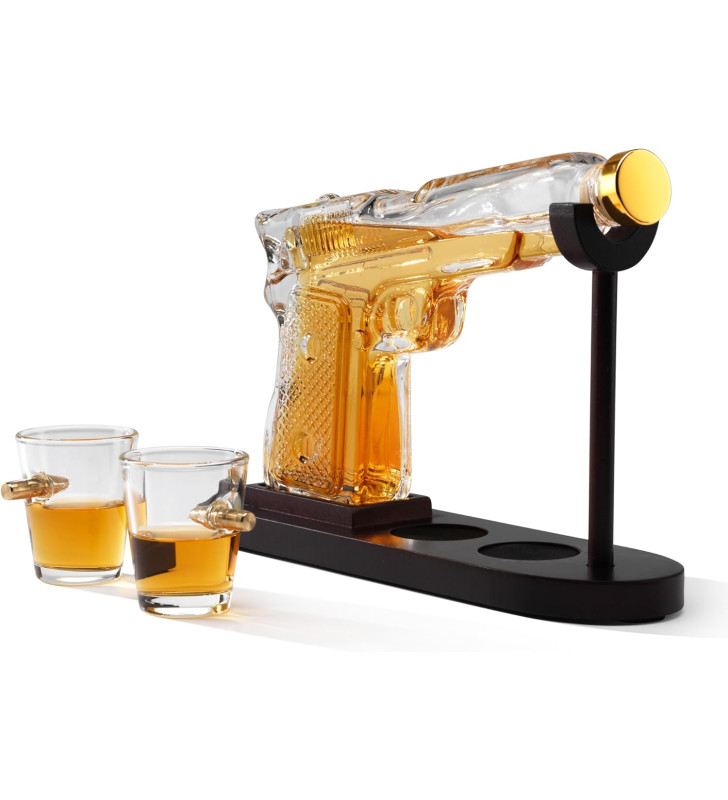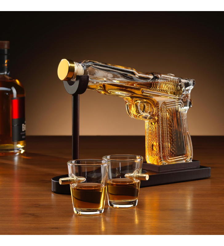 A striking pistol-shaped borosilicate glass decanter with a mahogany-effect stand and two bullet-embedded shot glasses. Perfect for whisky, spirits, gifting and home bars.