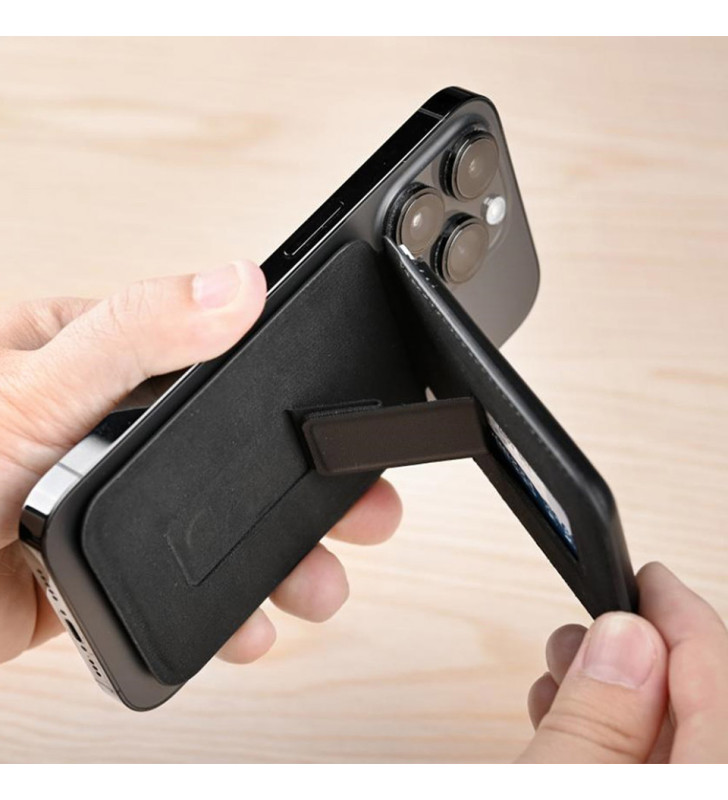 A sleek magnetic card holder that stores up to three cards and doubles as a handy phone stand. Lightweight, stylish and perfect for everyday use or travel.