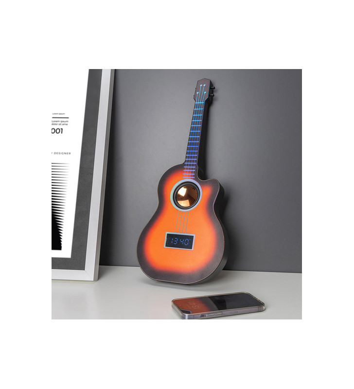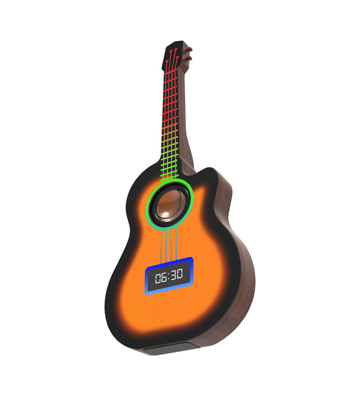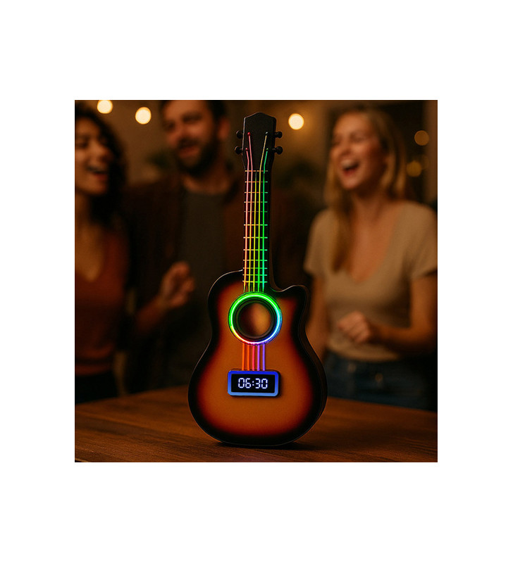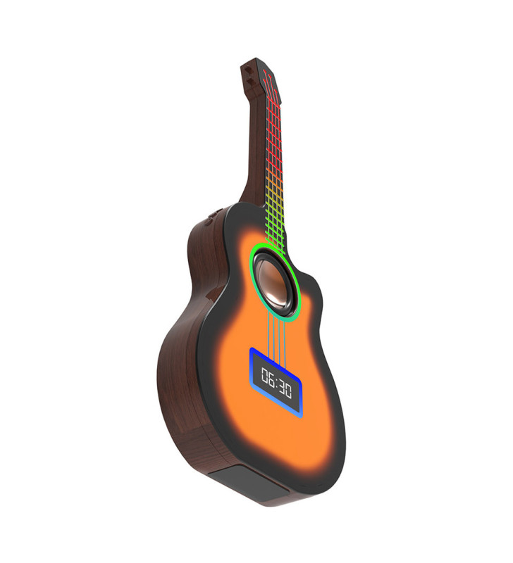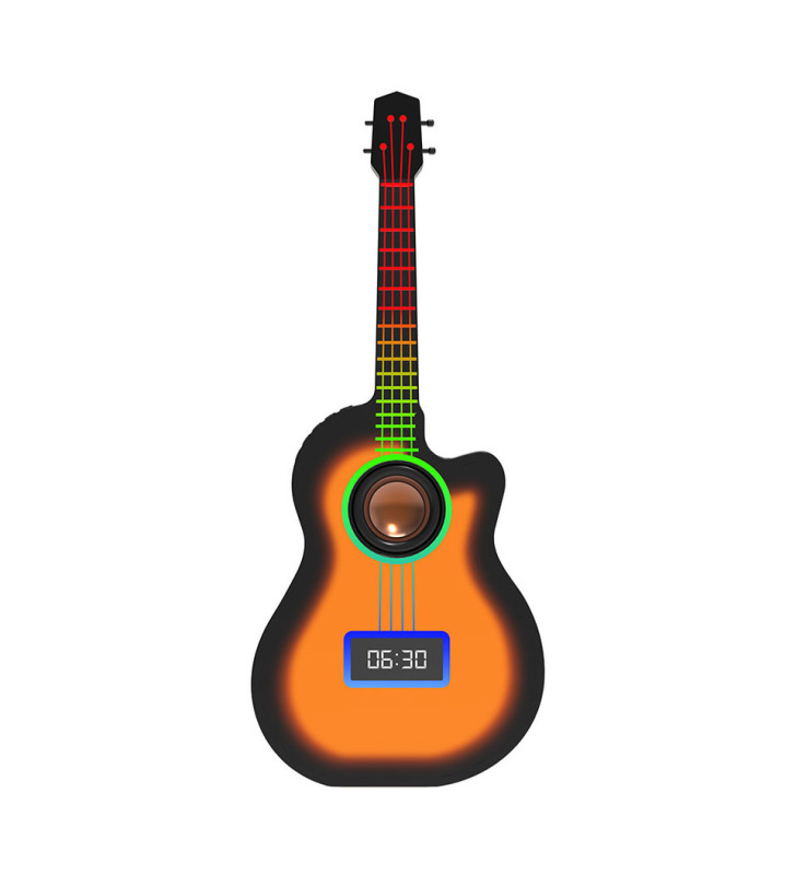 A quirky guitar-shaped 10W Bluetooth speaker with FM radio, built-in alarm clock and portable design. Perfect for music lovers, parties and everyday listening.