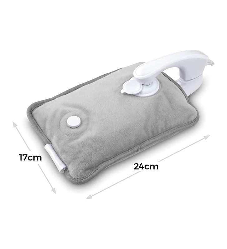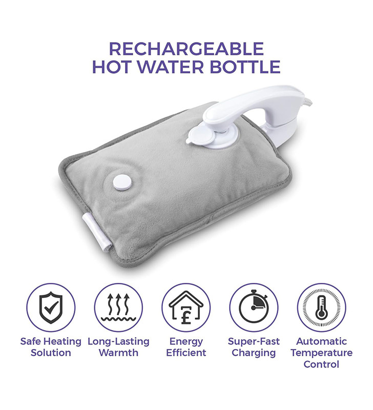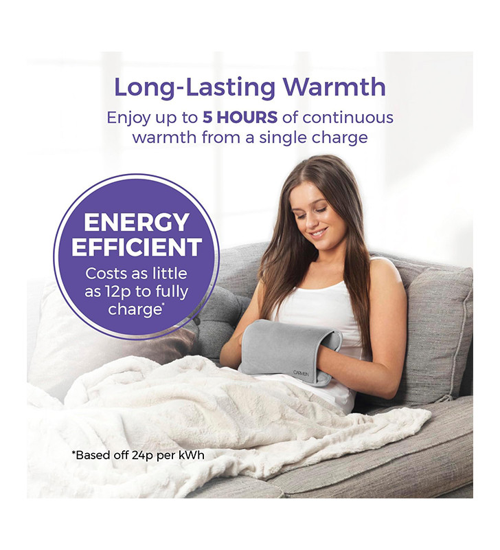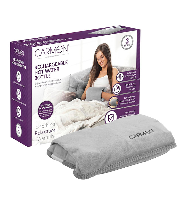 Description A safe, simple way to keep warm at home or in the office SAFE HEATING SOLUTION This rechargeable hot water bottle comes pre-filled with water already inside and permanently sealed so you never have to worry about refilling, leaks or scalding from boiling water LONG-LASTING WARMTH It heats up the water when powered on and unplugged to keep you warm in bed, retaining its temperature for up to 5 hours for long-lasting warmth and comfort overnight ENERGY EFFICIENT It costs as little as 12p to fully charge the Hot Water Bottle* based off 24p per kWh. Keep yourself warm and cozy as you snuggle up on the sofa and save on expensive energy bills. SUPER-FAST CHARGING Comes with a fast-charging adaptor that can fully charge the product in under 15 minutes AUTOMATIC TEMPERATURE CONTROL Provides a no-fuss way to warm up with automatic temperature controls to automatically maintain the perfect temperature, switching itself off after reaching approximately 60°C for safe use and long-lasting warmth SOOTHES ACHES & PAINS Acts as a heating pad to improve your blood circulation and can be used to alleviate pains from cramps, as well as relieve joint or muscle aches. The soft fleece cover and hand warmer pouch provide luxurious softness against your skin and offer supreme comfort THE PERFECT GIFT Ideal as a gift for a loved one or close friend as a reliable source of heat therapy or as a convenient and safe alternative to traditional hot water bottles 3 YEAR GUARANTEE Professional Carmen quality with a 1-year guarantee & optional 2-year extension, subject to product registration online Make bedtime even cosier with this Rechargeable Hot Water Bottle from Carmen. Safe and simple to use, it comes pre-filled with water and permanently-sealed so you never have to refill with boiling hot water or worry about leaking. Charging faster than a phone in under 15 minutes, it’s almost instantly ready for overnight use and keeps the water warm while unplugged for up to 5 hours. It only costs as little as 12p* to fully charge the Hot Water Bottle, keeping yourself warm and cozy, while you snuggle up on the sofa and save on expensive energy bills. The heat also has fantastic health benefits – not only keeping you warm in winter – it also helps soothe cramps, aches and pains, as well as improve blood circulation for longer-lasting comfort. Automatic temperature control provides the optimal amount of heat up to 60°C, while overheat protection ensures safe use. Designed using soft, comfy material and with a built-in pouch to keep your hands warm, this electric hot water bottle is made for a warmer, more comfortable night’s sleep. *(Based off 24p per kWh)