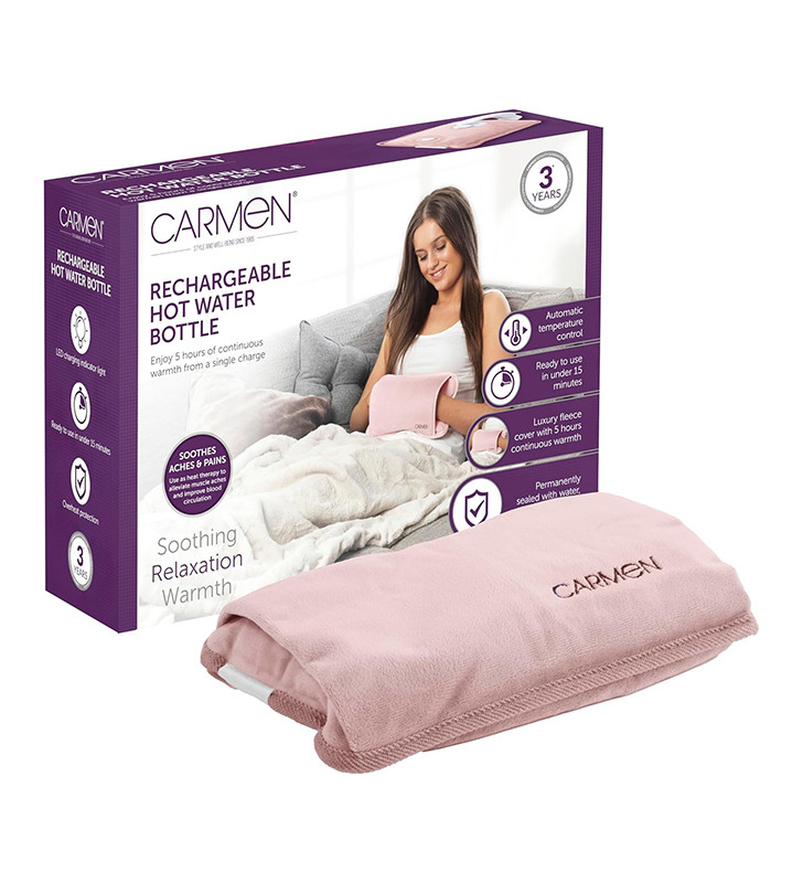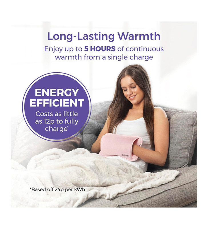 Make bedtime even cosier with this Rechargeable Hot Water Bottle from Carmen. Safe and simple to use, it comes pre-filled with water and permanently-sealed so you never have to refill with boiling hot water or worry about leaking. Charging faster than a phone in under 15 minutes, it’s almost instantly ready for overnight use and keeps the water warm while unplugged for up to 5 hours. It only costs as little as 12p* to fully charge the Hot Water Bottle, keeping yourself warm and cozy, while you snuggle up on the sofa and save on expensive energy bills. The heat also has fantastic health benefits – not only keeping you warm in winter – it also helps soothe cramps, aches and pains, as well as improve blood circulation for longer-lasting comfort. Automatic temperature control provides the optimal amount of heat up to 60°C, while overheat protection ensures safe use. Designed using soft, comfy material and with a built-in pouch to keep your hands warm, this electric hot water bottle is made for a warmer, more comfortable night’s sleep. *(Based off 24p per kWh)