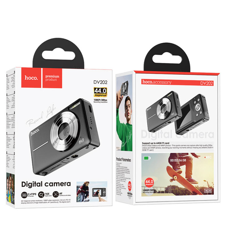 HOCO DV202 is a modern, lightweight digital camera equipped with a 5-megapixel CMOS sensor and a 2.4-inch IPS HD display with a resolution of 320x240. With support for photos with a resolution of up to 44 MP and video recording in Full HD quality, the camera is perfect for everyday photography and filming in high quality.