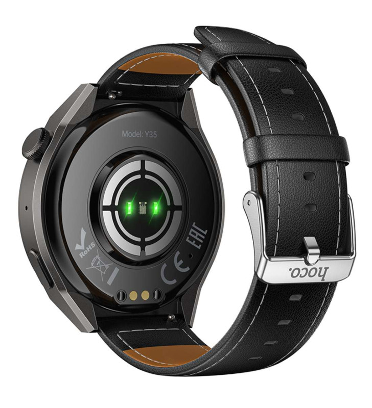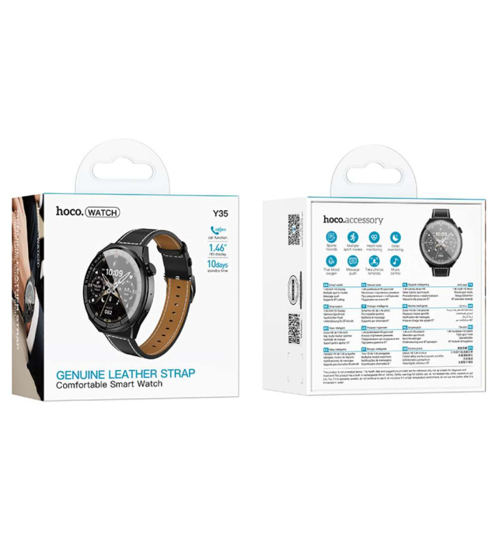 The watch includes a variety of health and fitness tracking features such as heart rate monitoring, sleep analysis, step counting, calorie tracking, and multiple sports modes — helping you stay informed and motivated.With its IP67 waterproof rating, sleek Black finish, and comfortable strap (leather or sport design, depending on variant), the Hoco Y35 blends durability and style for any lifestyle.