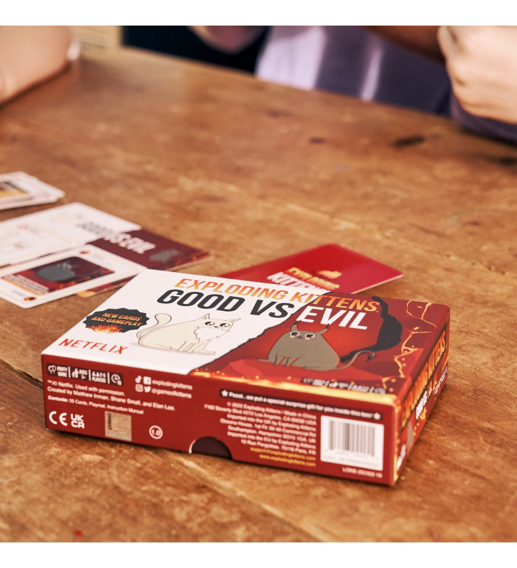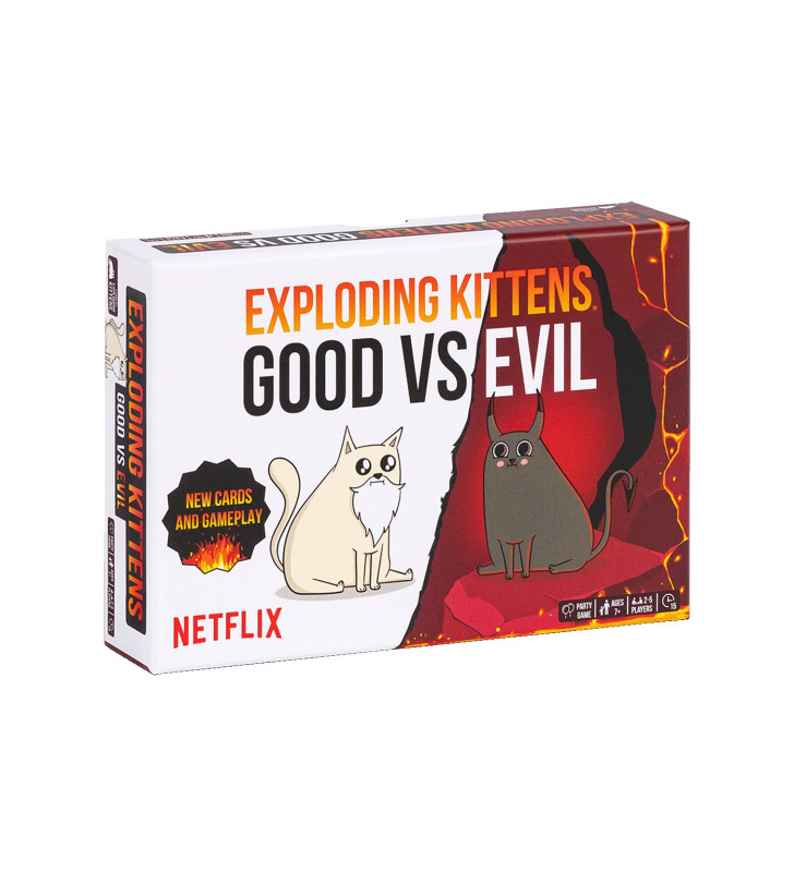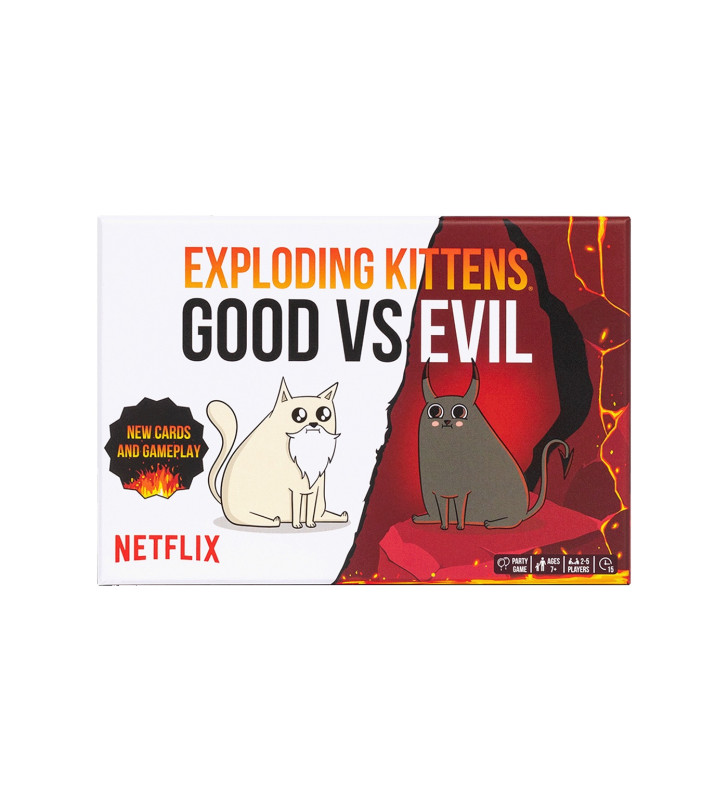 Exploding Kittens: Good vs Evil takes the iconic card game to a whole new level of chaos, strategy, and hilarity. Inspired by the first-ever Exploding Kittens Netflix series, this edition introduces brand-new artwork, characters, and game mechanics that raise the stakes higher than ever before.