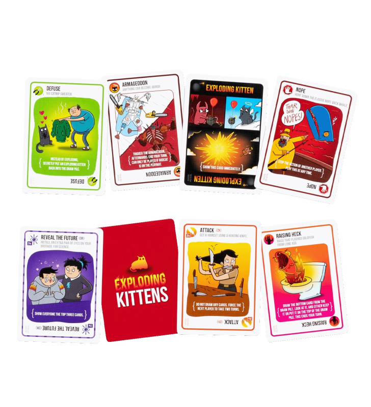In this kitty-powered game of Russian Roulette, God and the Devil have been turned into cats and unleashed into your living room. Players draw cards, play actions, sabotage their opponents, and try to avoid drawing an Exploding Kitten—unless they have a way to defuse it. Outsmart your friends, stir up mayhem, and survive long enough to be the last player standing.