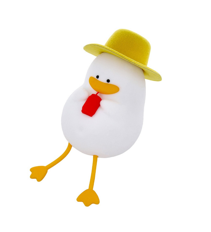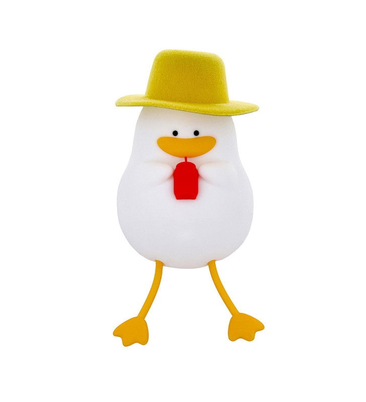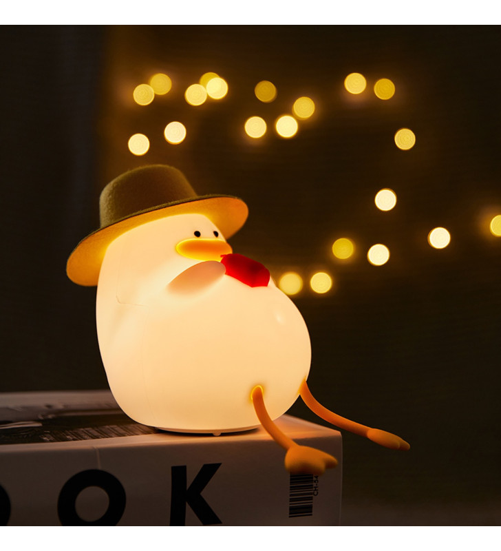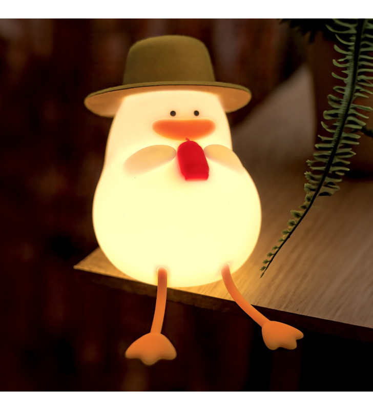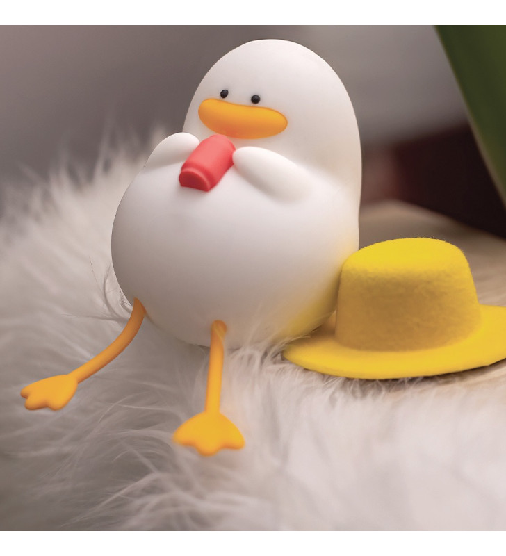 Cute LED night lamp shaped like a duck on vacation, with warm white light, soft-touch silicone and rechargeable battery.
