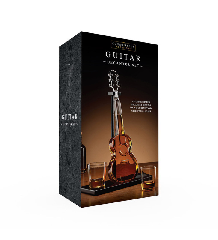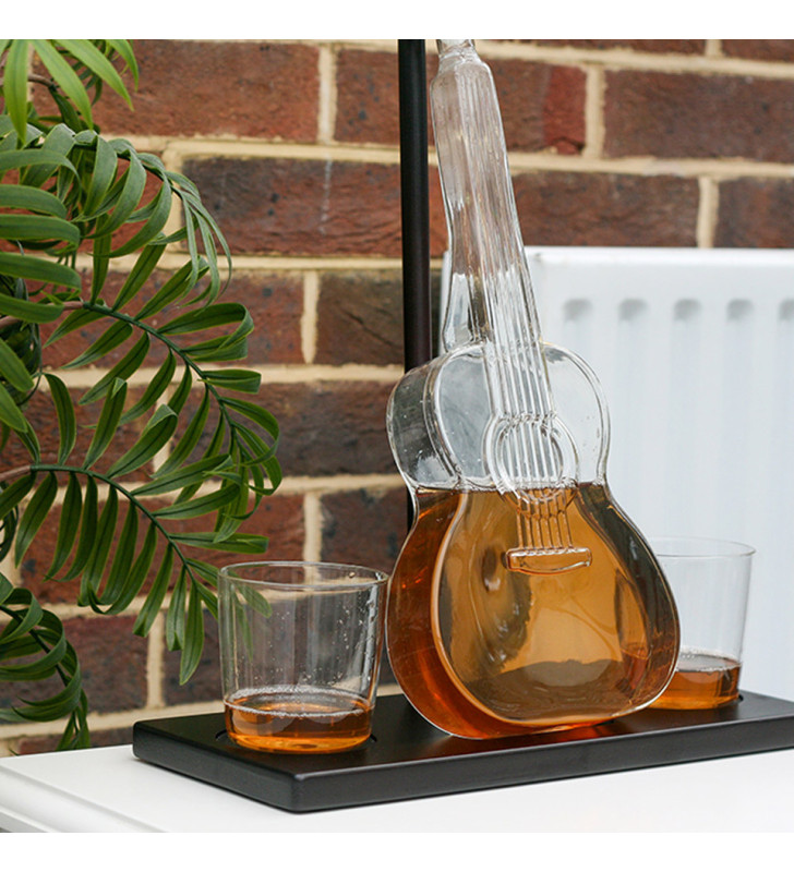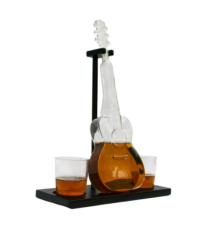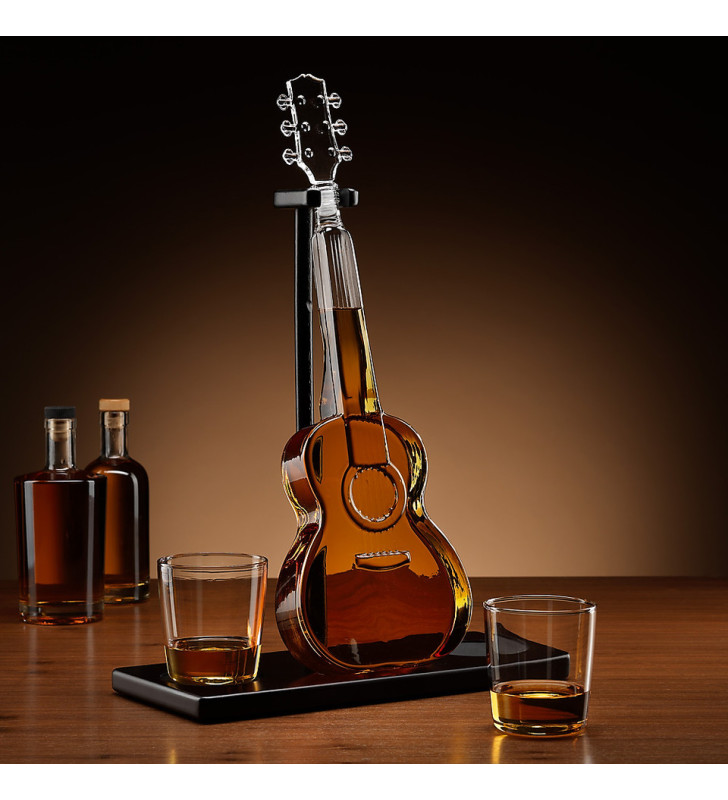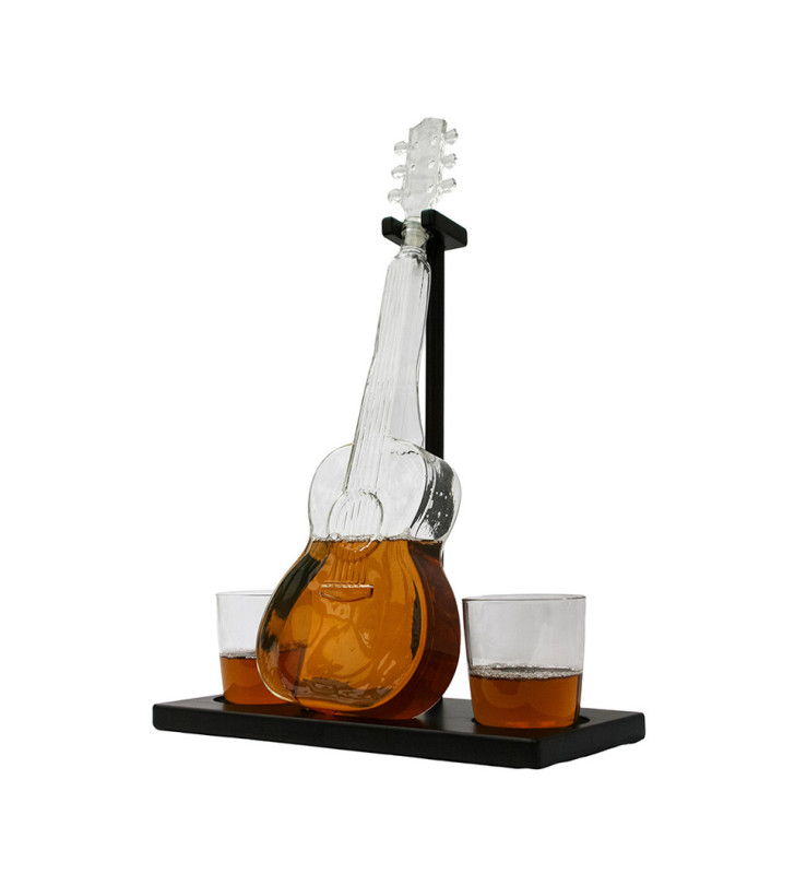 - Features a charming guitar-shaped decanter for stylish beverage serving.