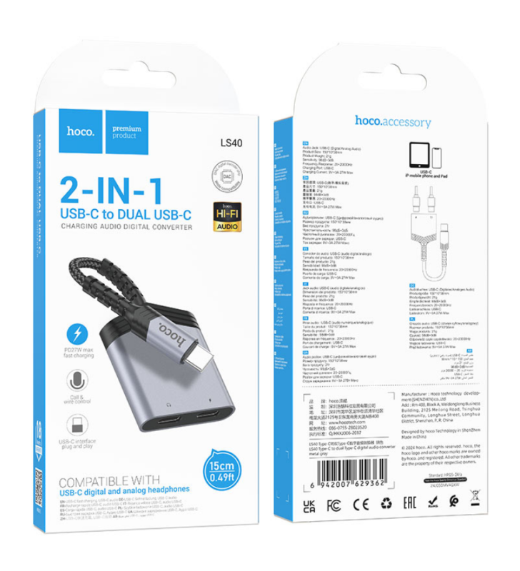 The LS40 Type-C to Dual Type-C Audio Adapter is designed for modern devices that rely fully on USB-C connections. It allows you to use USB-C headphones while charging your device simultaneously, without compromising on sound quality or charging speed.