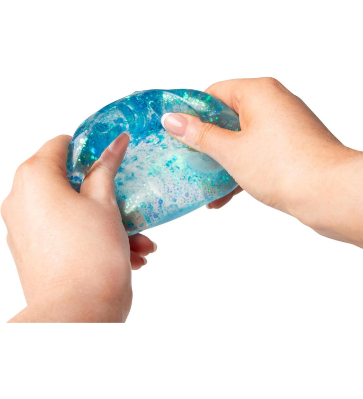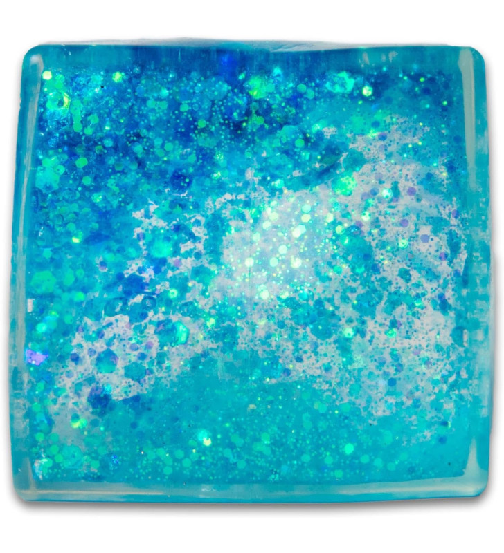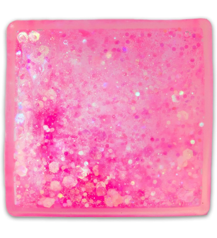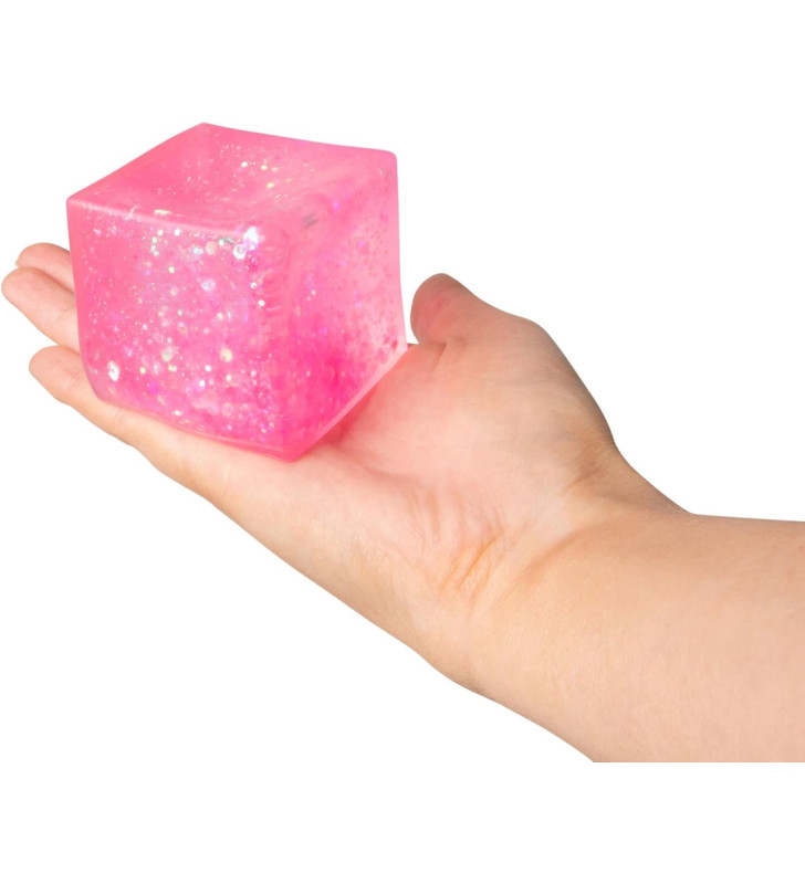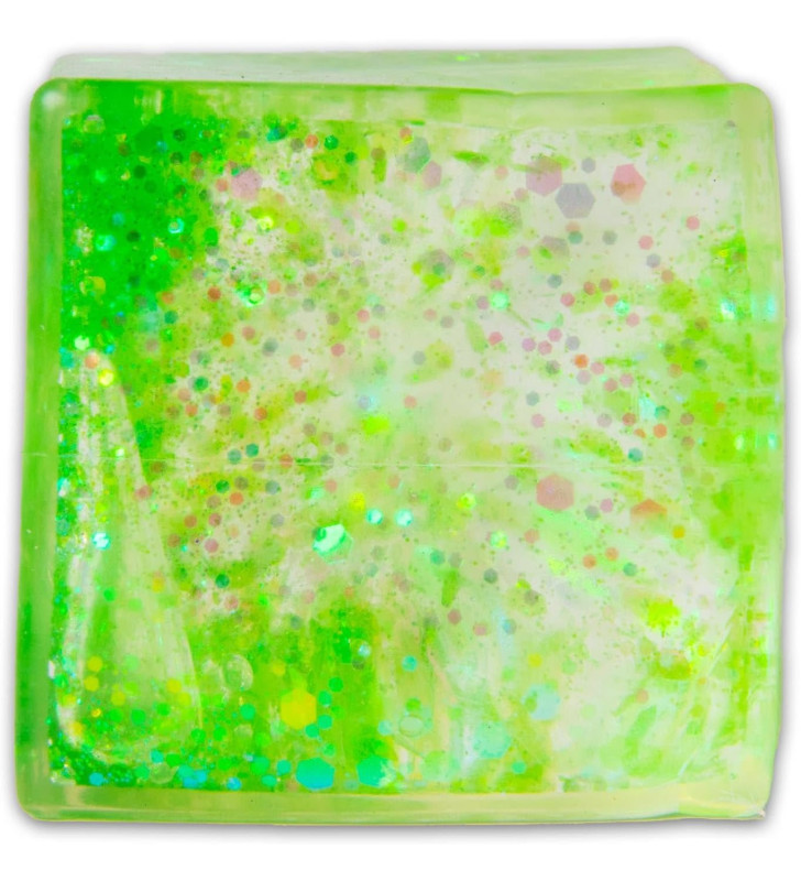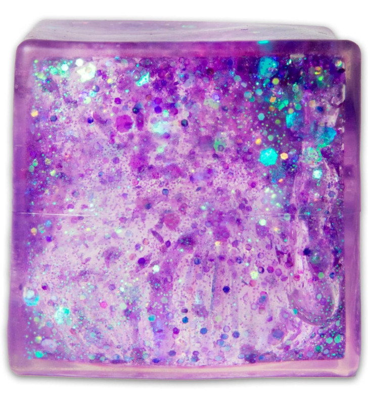 - Squishy glitter-filled sensory cube with slow-moving gel for stress relief and tactile play.