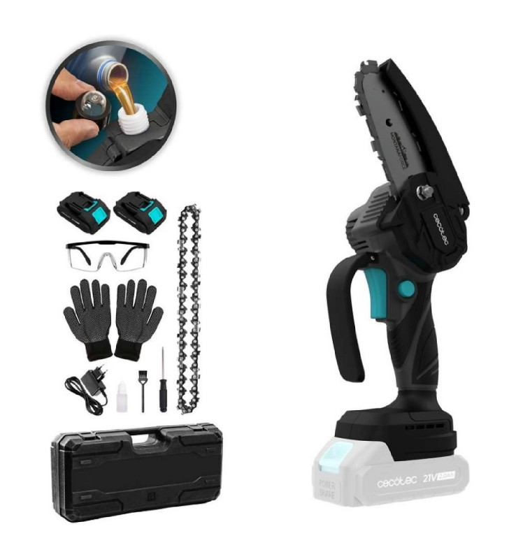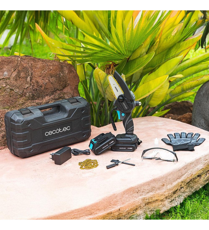 Compact cordless mini chainsaw with 400W power, 2 batteries and full accessory kit.