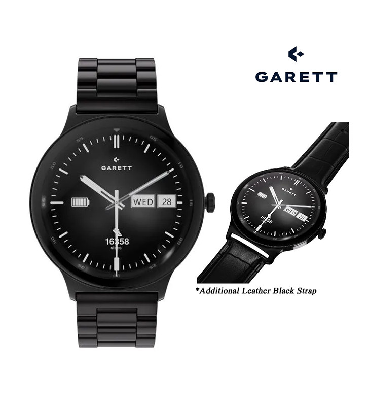 Garett QUANTUM Smartwatch | BLACK STEEL (with Additional Black Leather Quick Release Strap)