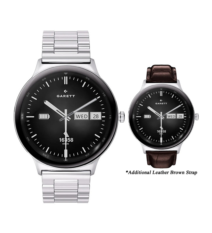 Garett QUANTUM Smartwatch | SILVER STEEL (with Additional Brown Leather Quick Release Strap)