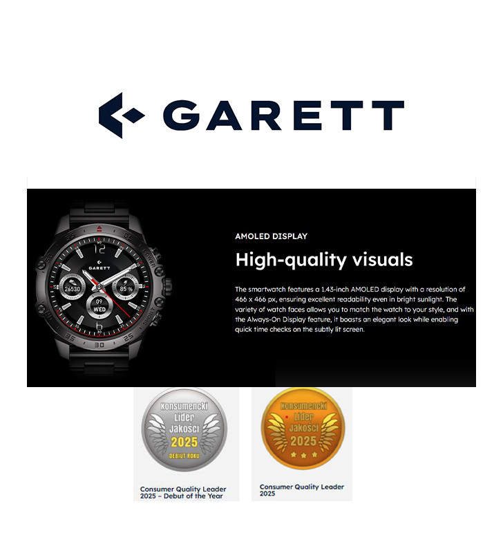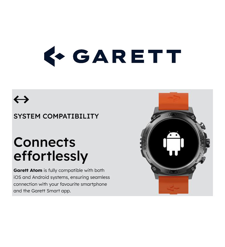 A balance between style and performance. The Garett Atom is designed for everyday use, combining a clean steel design with practical smart features and reliable battery life.