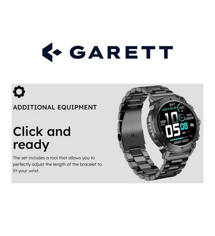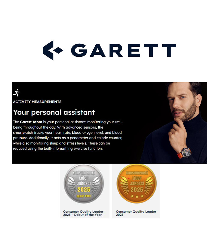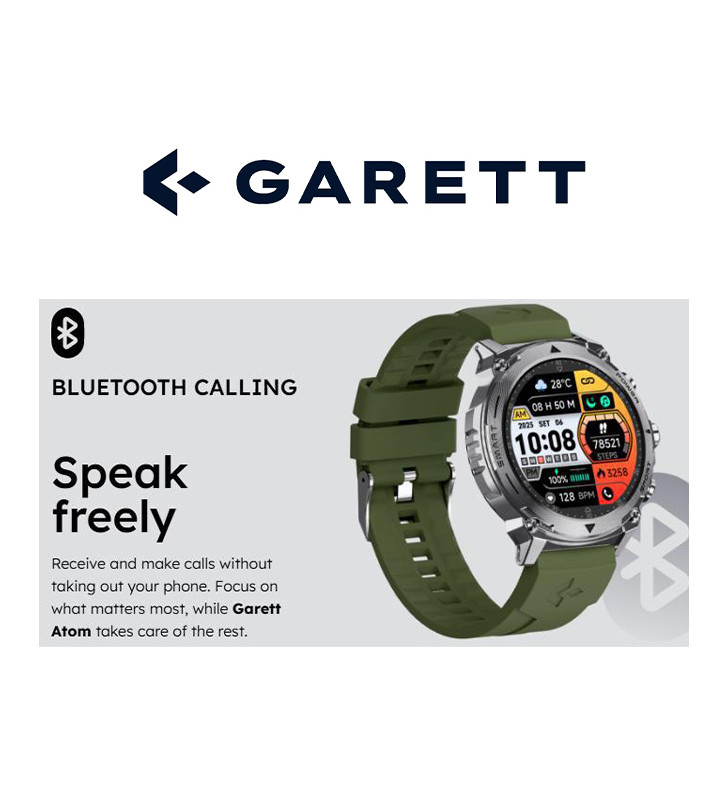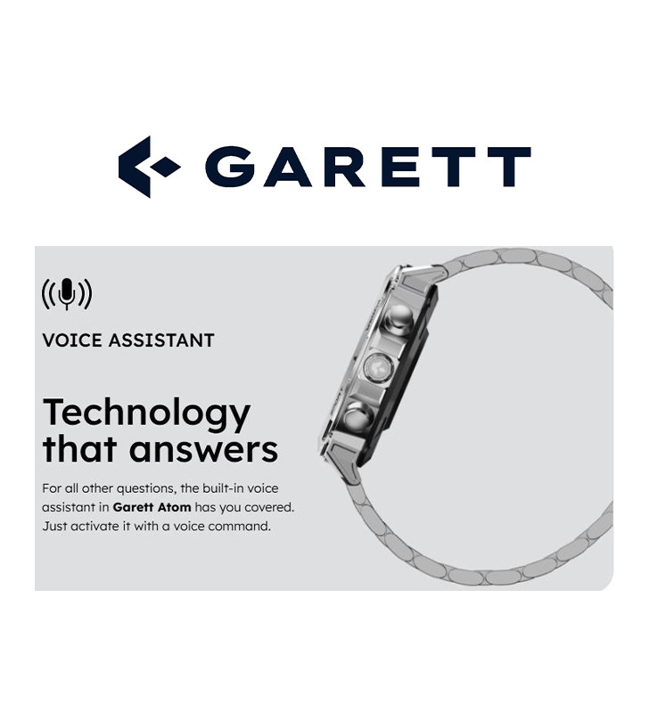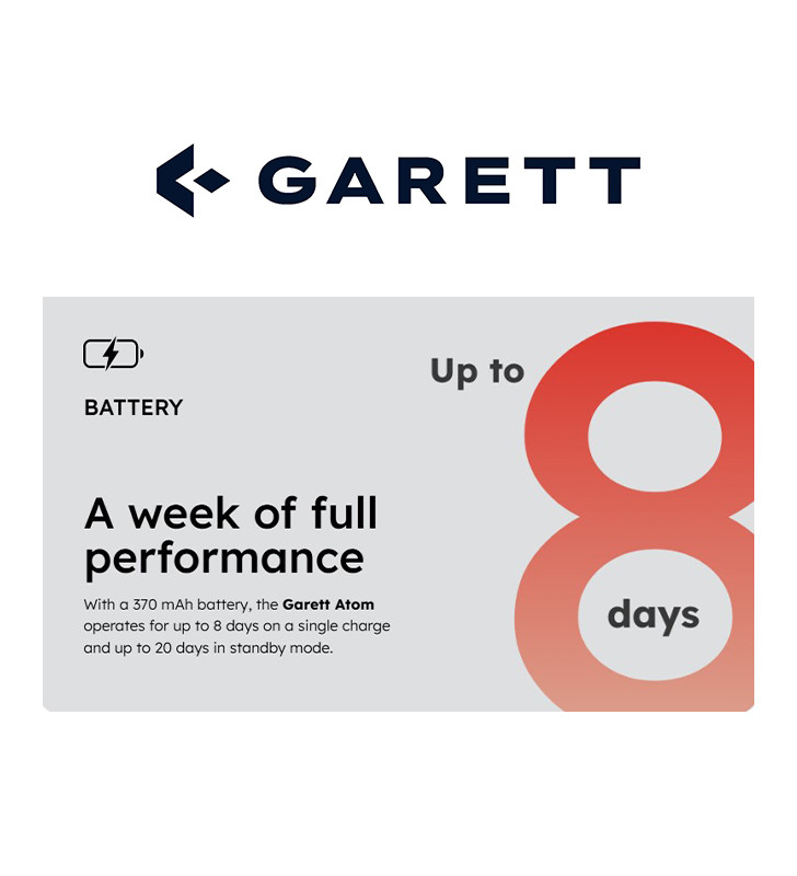A balance between style and performance. The Garett Atom is designed for everyday use, combining a clean steel design with practical smart features and reliable battery life.